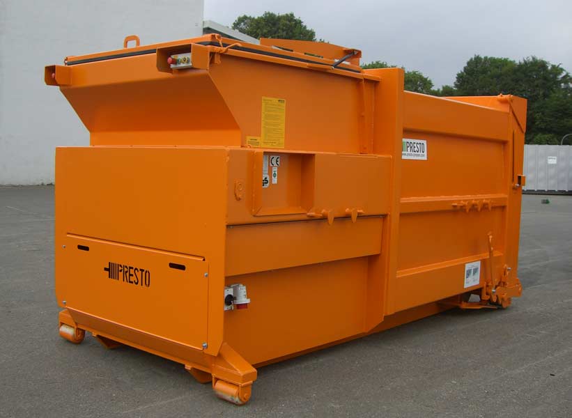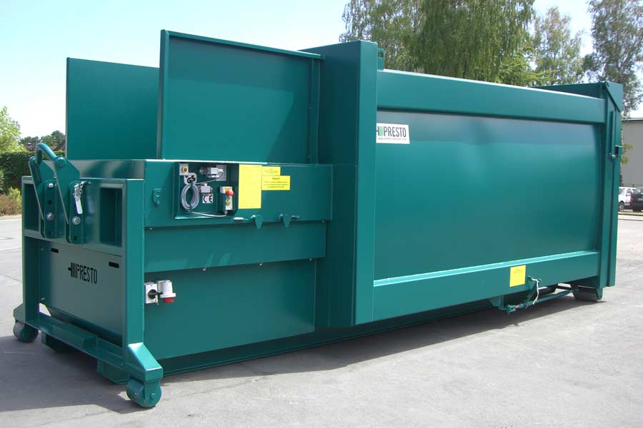 Die PRESTO Nassmüllpressen werden eingesetzt, wo größere Mengen an feuchtem oder sehr nassem Rest- oder Hausmüll ähnlichem Gewerbeabfall anfallen. Wie beim Presscontainer auch, ist die Presseinrichtung der Nassmüllpresse fest mit dem Behälter verbunden ist. Die Verdichtung des Materials erfolgt durch eine pendelnd, in Polyamidschalen gelagerte Pressplatte, welche elektro-hydraulisch angetrieben wird.