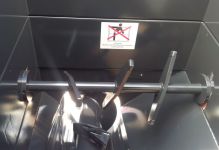 Sollen größere Eingabemengen von ca. 3 - 5 Paletten verpresst werden, wird die grobe Vorzerkleinerung effektiv durch die verstärkte Zuführeinrichtung HD vorgenommen. Sie besitzt einen eigenen Antrieb (1,5 kW) und ist in einem parallelwandigen Zwischenaufsatz (500 hoch) eingebaut. Die Welle mit 80 mm Durchmesser ist mit drei massiven Brechelementen bestückt und quer zur Schneckenwelle angeordnet. Durch die Antriebsverknüpfung mit dem Schneckenverdichter ist eine Überlastung ausgeschlossen.